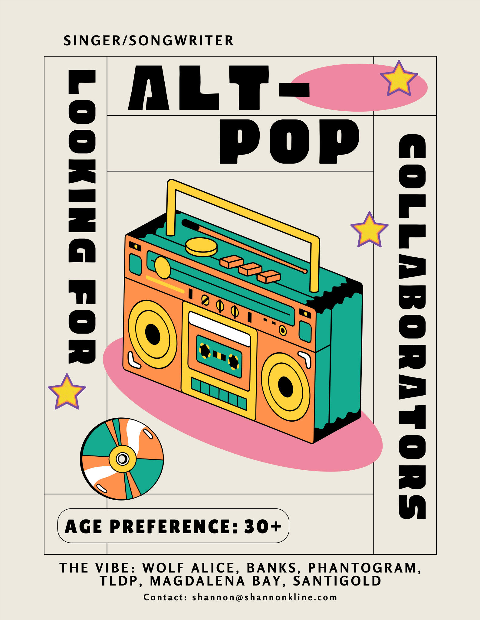 I started writing songs twenty years ago, just me and a piano. As a solo artist, I wrote and recorded two albums and an EP ...but it's been a while. I'm ready to have fun with music again, but I know my best work requires a little help from some friends. If you're a musician who admires any or all of the groups listed on my flyer, I'd love to hear from you. I'm particularly interested in meeting percussionists, electric guitar players, and synth pop producers, but if you're intrigued at all, please reach out!Email [email protected] for more info.